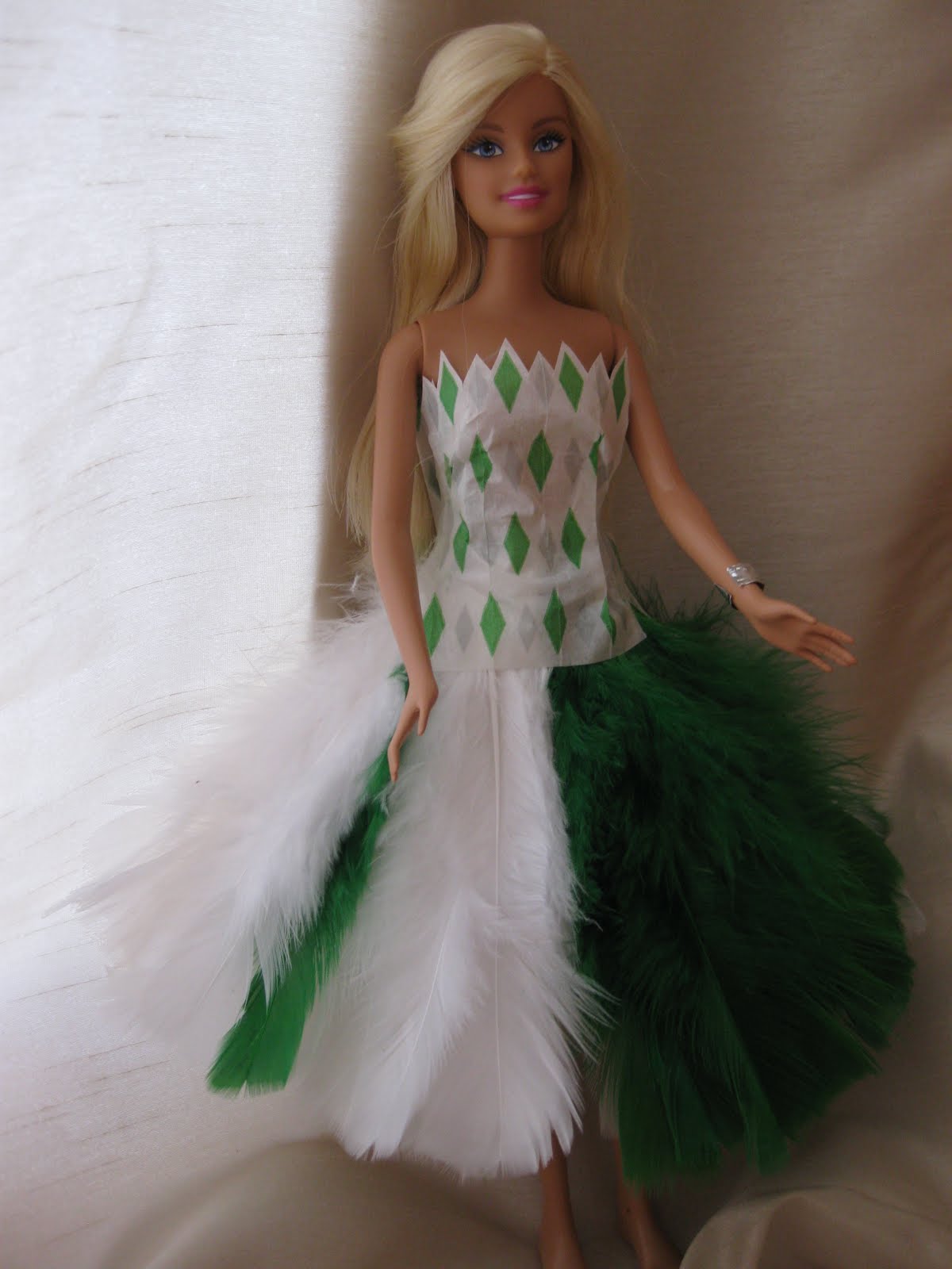 The skirt is broken into two blocks of color, there is a green side and a white side. Then there is one green feather on the white side and one white feather on the green side.